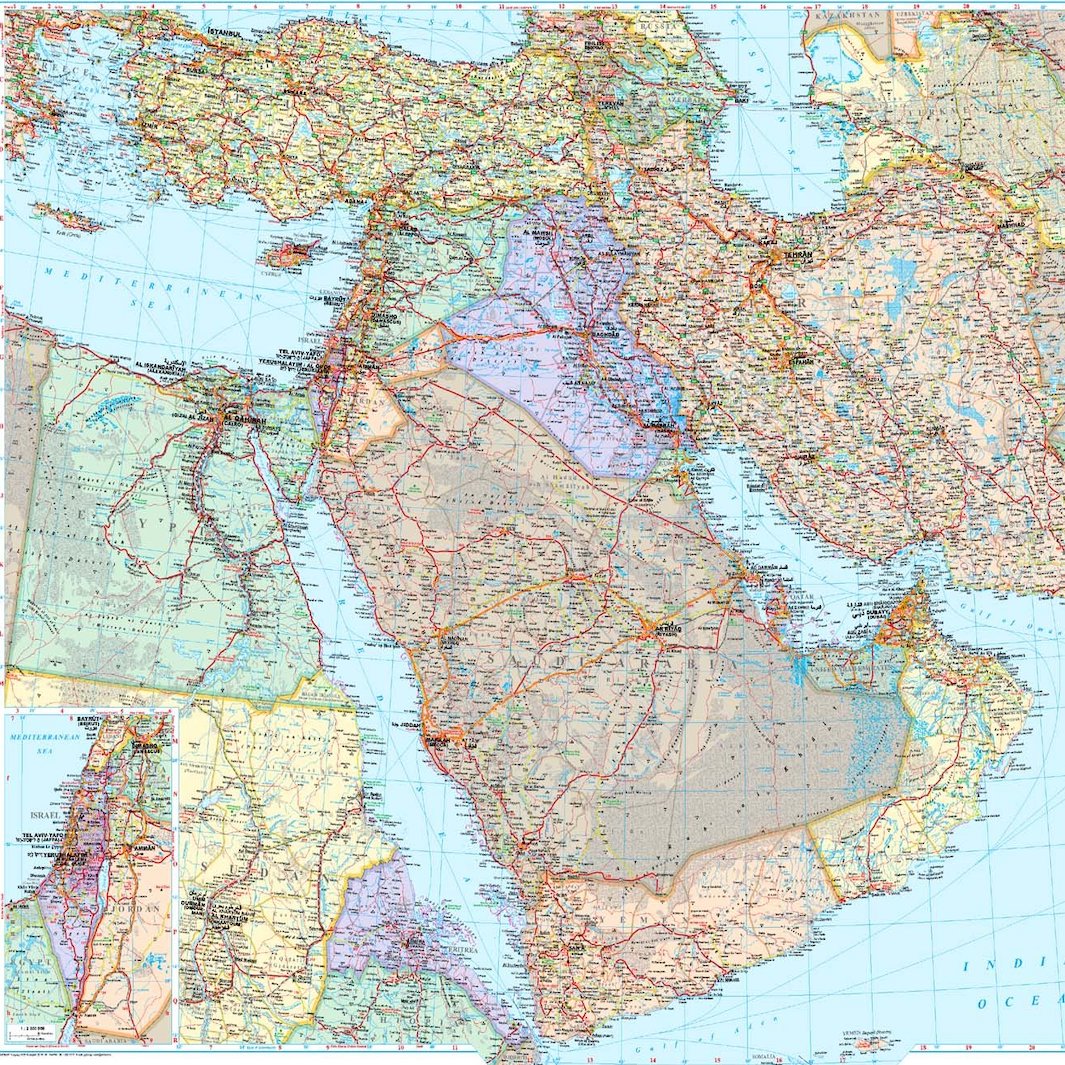 Des posters du Moyen-Orient incluant des cartes de l'Iran et de l'Irak.