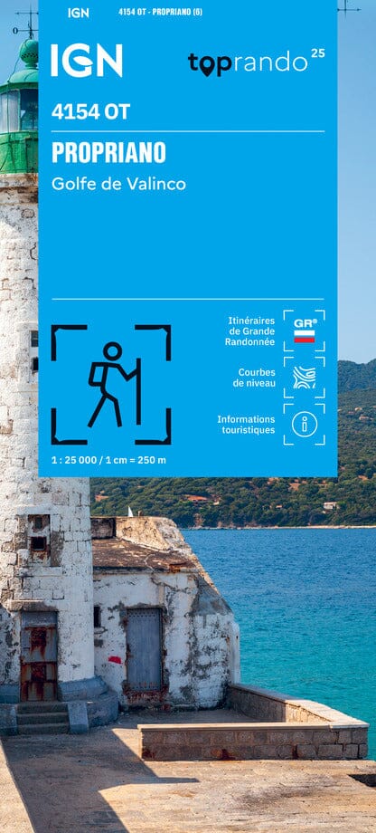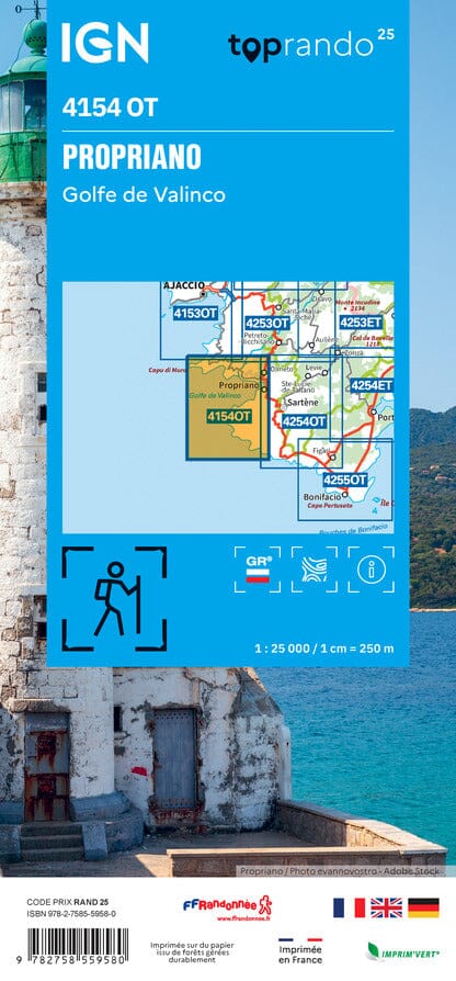 Carte topographique IGN TOP 25 n° 4154OT qui couvre Propriano et le Golfe de Valinco. Cette carte de randonnée propose des courbes de niveau espacées de 10 mètres et une légende détaillée (végétation, rochers, voies de communication jusqu'au moindre sentier, constructions jusqu'au hangar, bois, arbre isolé, rivière, source etc.).