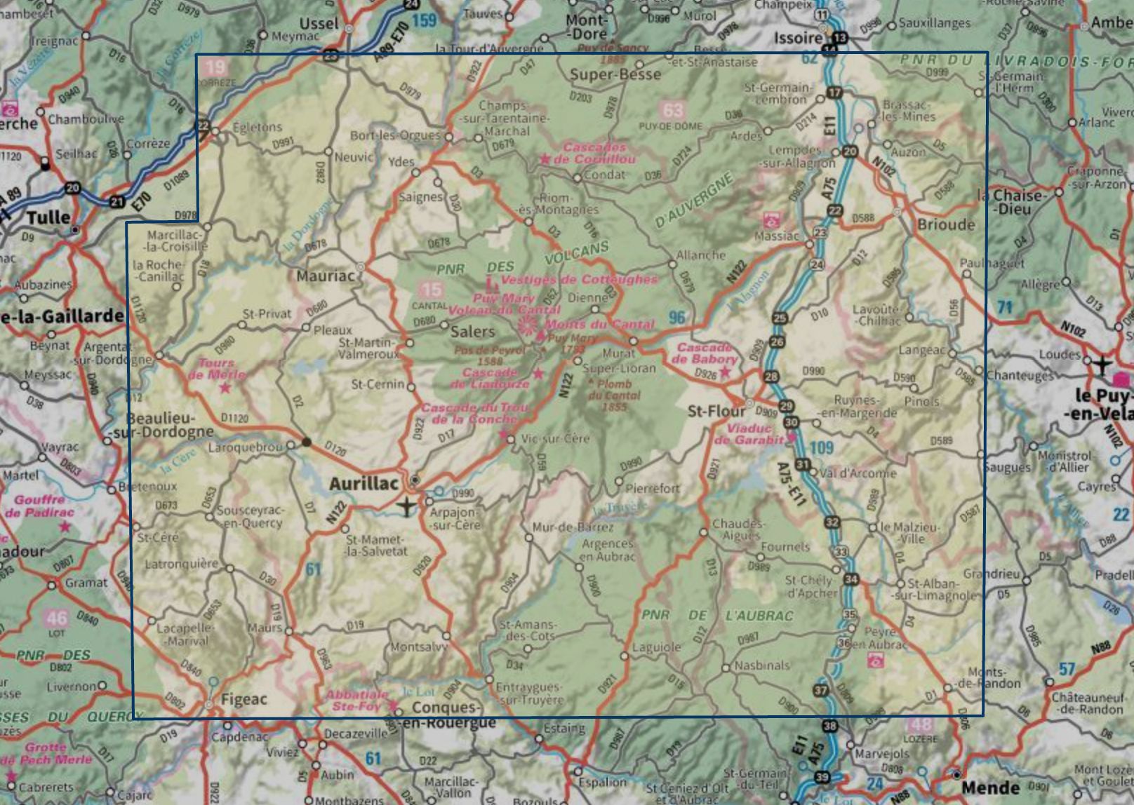 Carte touristique TOP 100 D15 - Cantal : Aurillac, St Flour, Monts du Cantal, Pnr des Volcans d'Auvergne | IGN