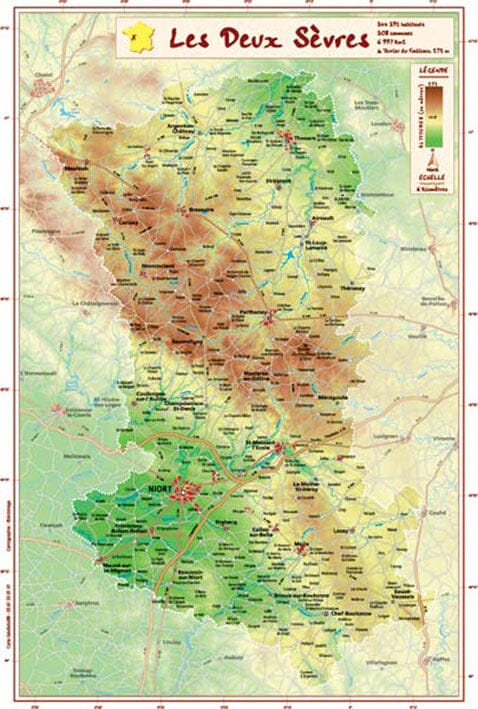 Petite carte en relief des Deux-Sèvres qui indique également les communes du département.