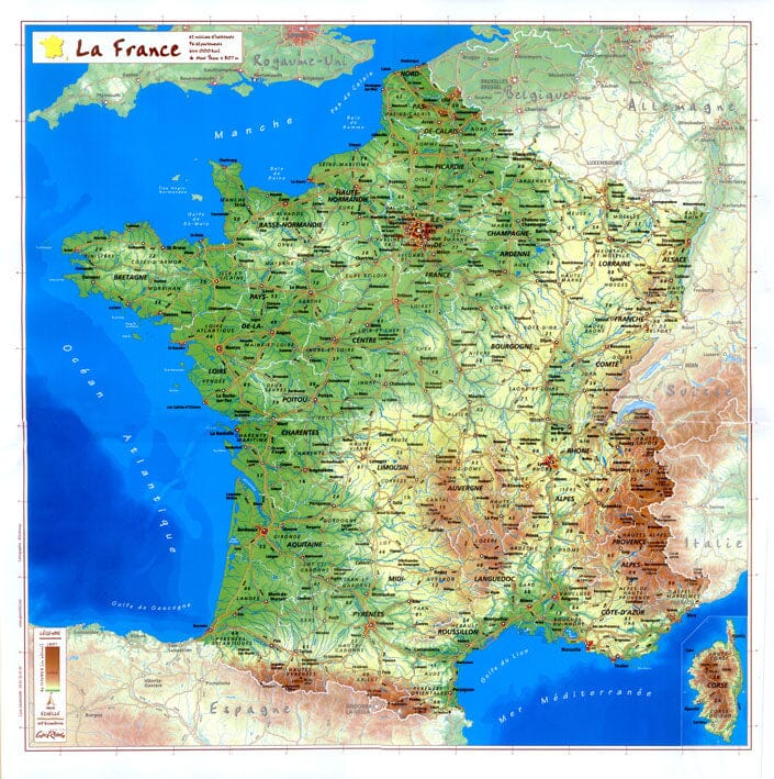 Petite carte en relief de la France qui comporte les principaux sommets, fleuves et affluents et l'ensemble des préfectures et sous-préfectures, les limites départementales et le réseau routier qui relie ces villes.