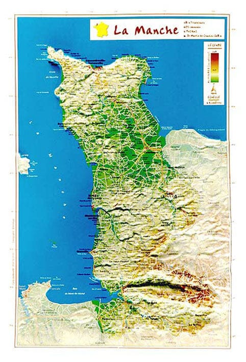 Petite carte en relief de la Manche qui indique également les communes du département.