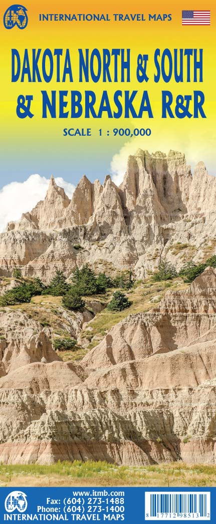 Carte routière du Dakota du Nord, du Dakota du Sud et du Nebraska éditée par ITM. Cette carte couvre tout le Dakota du Nord, le Dakota du Sud et, au verso, le Nebraska. Une partie du Minnesota voisin est incluse. Bien que la carte se concentre sur son réseau routier, l'accent est aussi mis sur le réseau ferroviaire Amtrak qui passe par Bismarck, ND et Omaha, plus au sud. C'est le pays des Prairies à son meilleur, s'étendant de la frontière avec le Manitoba au sud du Canada jusqu'à Kansas City, et du Montana à l'est jusqu'au Minnesota.
