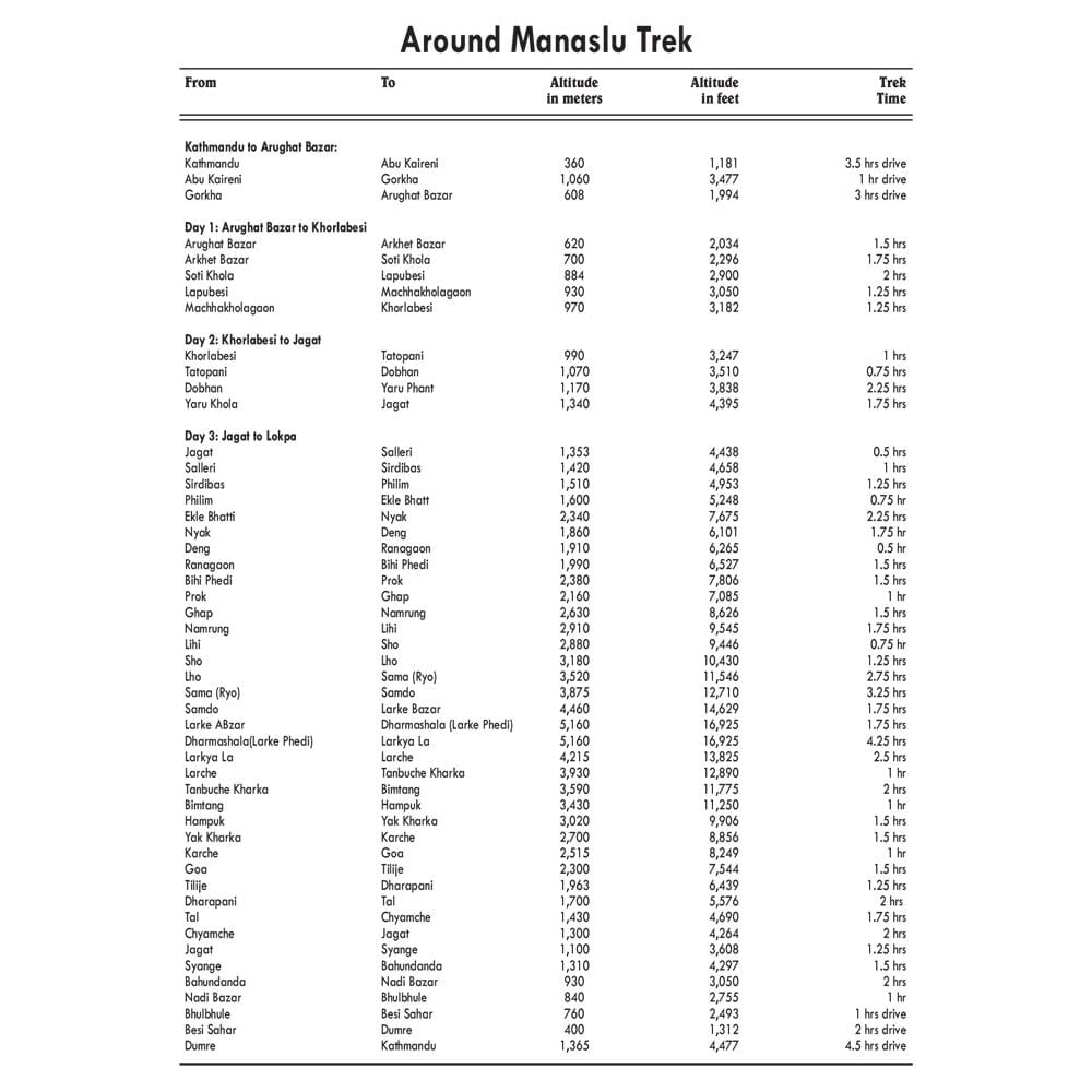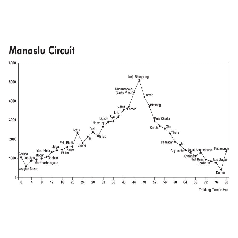 Gorkha, Arughat, Barpak, Laprak, Liding, Machha Khola, Jagat, Lokpa, Chumling, Chhokangparo, Mu Gomba, Ngku, Gomba Lungdang, Ripchet, Pewa, Bihi, Syarang, Serang, Prok, Bihi, Phedi, Lihi, Syala, Samagaon, Samdo, Dharmasala, Bhimthang, Dharapani, Chamchet, Besisahar.