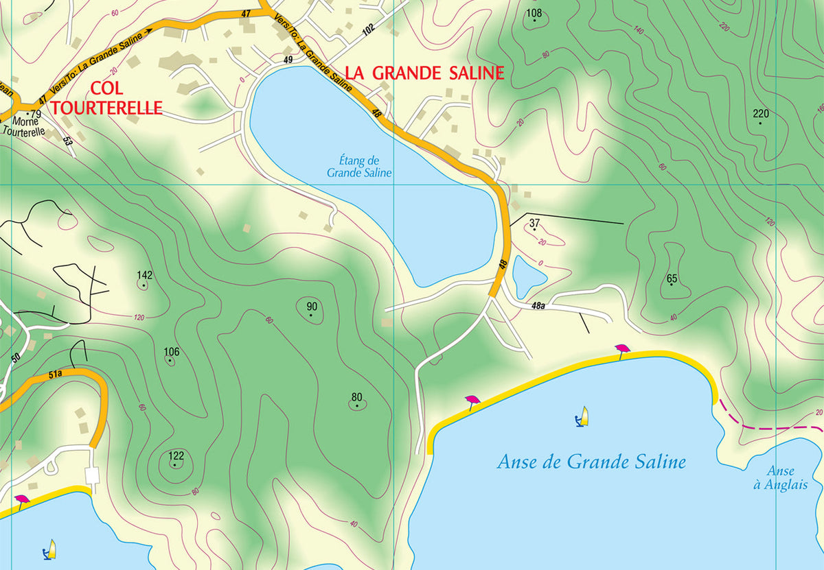 This complete road map with a street index of Saint - Barthelemy (scale 1: 10,000) takes up all the known roads and streets of the island with their names - current names in French, historical names in Swedish - and locates the trails of hiking .