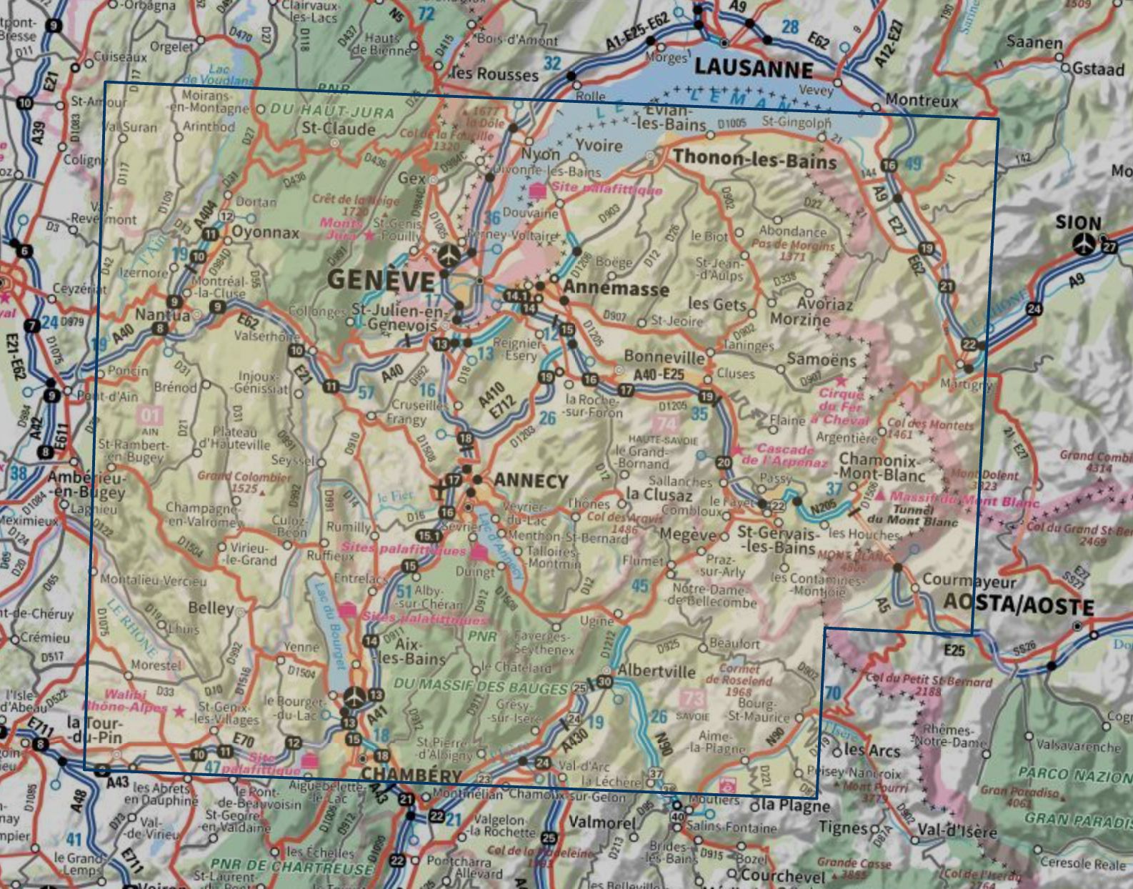 TOP 100 D74 Tourist map - Haute-Savoie: Annecy, Thonon-les-Bains, Mont-Blanc Massif, Aravis | IGN