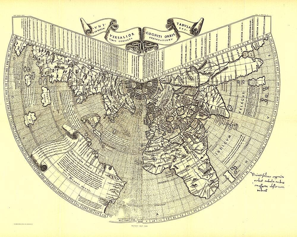 One of the earliest maps of the New World, Johannes Ruysch created this map using a polar projection, which includes an extensive view of South America, the islands of the Antilles, and part of North America. Ruysch's world map first appears among the Tabulae Novae in some copies of the 1507 Roman edition of Ptolemy's Geography. Ruysch's map illustrates several important geographical features more accurately than previously possible, particularly along the eastern sea route to the Orient, which was of prime importance to early 16th-century Europeans. An incredible historical piece.
