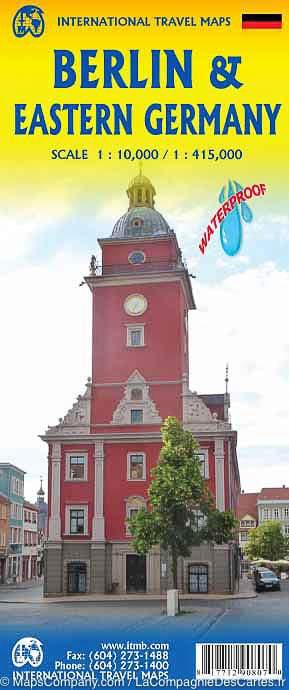 Great waterproof Plan of Berlin and Map of Eastern Germany published by ITM. On the front, there is a detailed plan of Berlin on a 1/10,000 scale (1 cm = 100 m). On the back, a detailed map of the eastern part of Germany at 1/415,000 (1 cm = 4.15 km) which covers roughly the territory of the former RDA. Indication of the main orange roads, high pink roads and local roads in white. Symbols indicate points of interest (buildings, tourist attractions, shops, nature reserves ...). Railway lines are also marked. Mapping the relief and index of cities included.