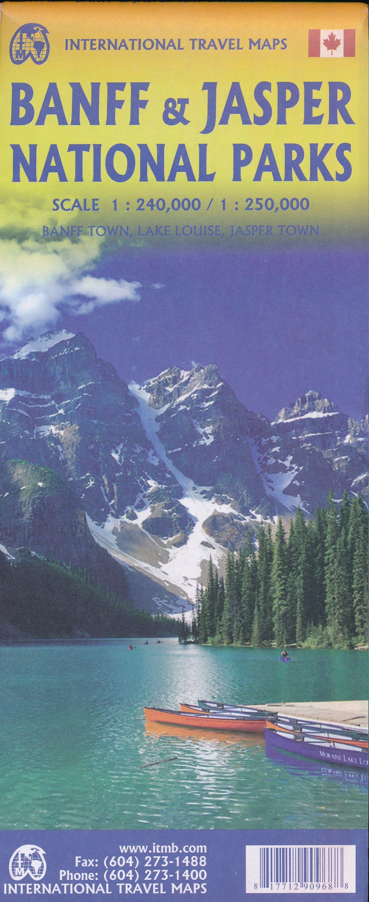 Detailed map of Banff & Jasper National Parks (Canada) published by ITM. On the front, a map of Banff National Park and on the back, a map of Jasper. It shows the terrain, hiking trails, campsites, and major and minor roads, with distances.