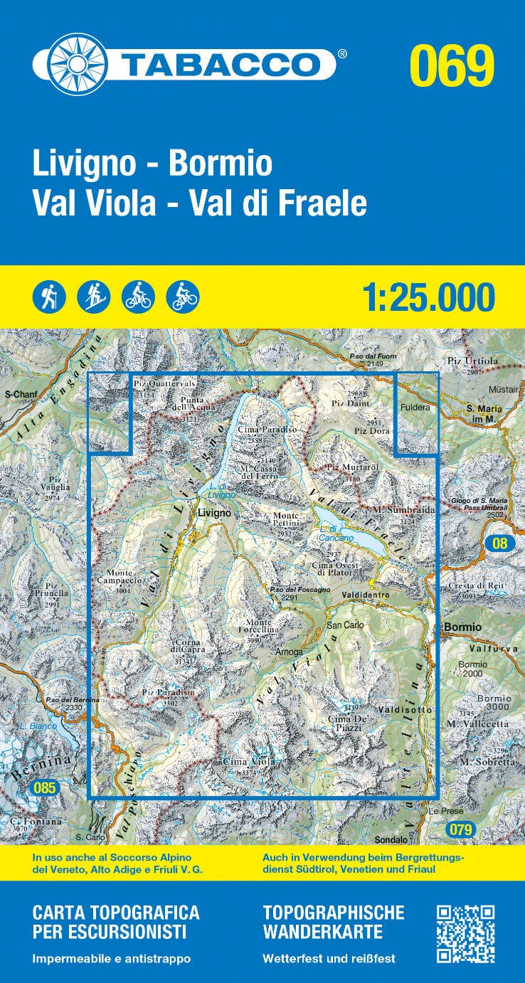 Waterproof topographic map published by Tabacco which covers the region of Livigno, Bormio, Passo del Bernina. Contour lines spaced 25 meters apart.
