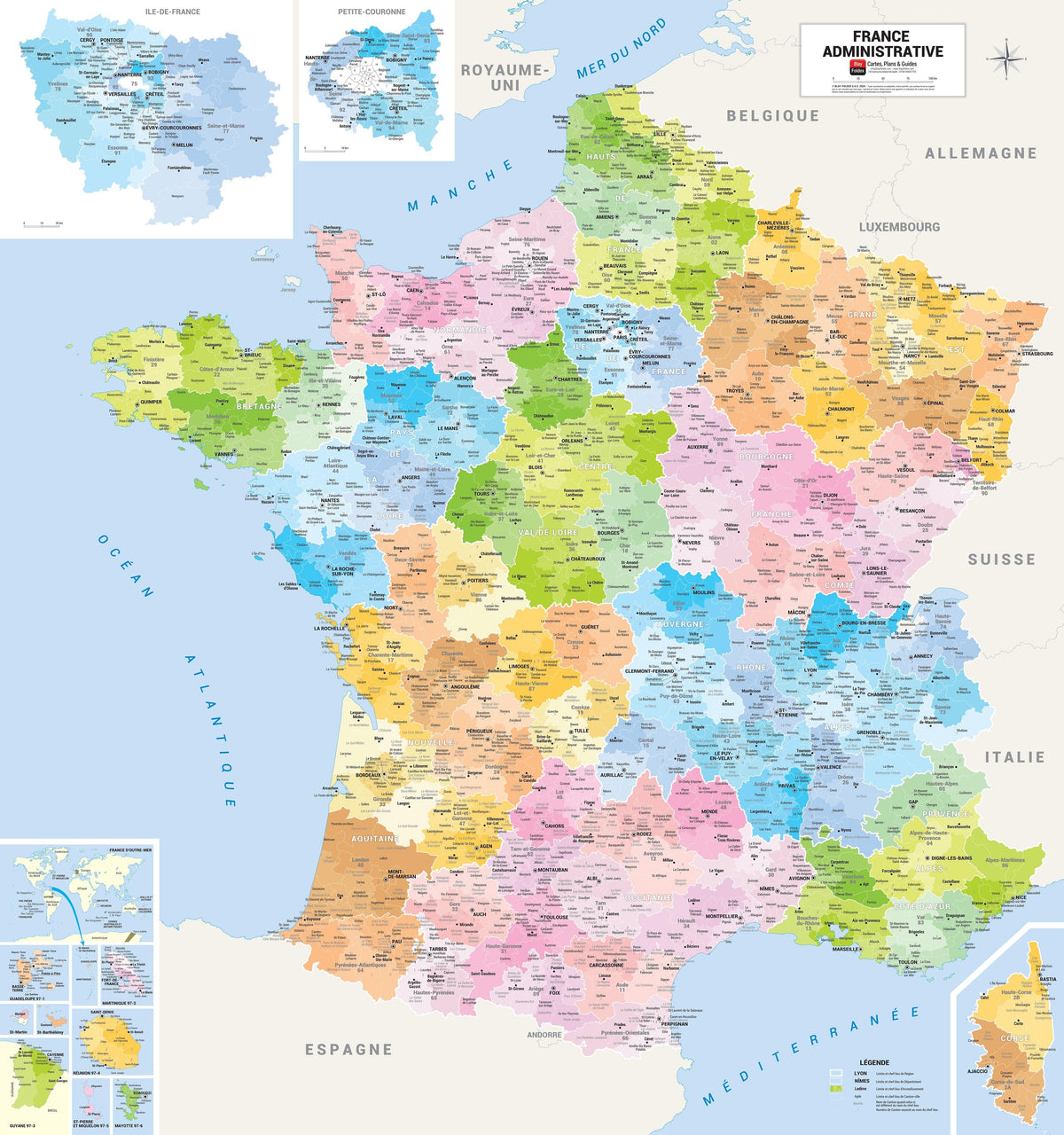 This matte-laminated administrative map offers a clear and detailed view of France. Thanks to a carefully selected range of colors, regions, departments, and cantonal cities are easily distinguished for better visual understanding. The map is designed to be both aesthetically pleasing and functional, making it ideal for professional or personal use.