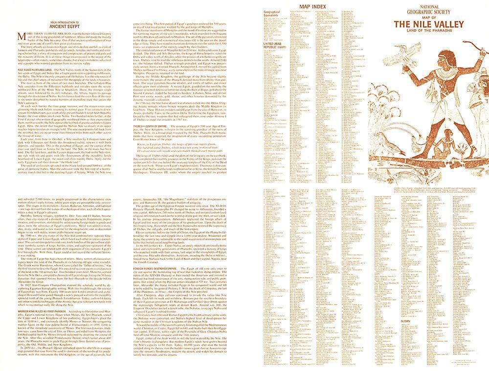 Your introduction to ancient Egypt was published in National Geographic in May 1965 to accompany the map "The Nile Valley, Land of the Pharaohs" and the article "A Yankee Cruise on the Legendary Nile." The four-panel text introduces you to Egypt and its history, with information on how the Nile's annual floods nourish the land, the first pharaoh, Egypt's dynasties, and the fall of this great civilization. It also includes an index to the map "Nile Valley, Land of the Pharaohs."