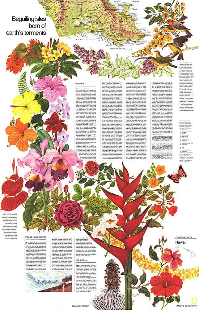 Discover the exotic beauty of the 50th state with this travel poster and map of "Hawaii: Alluring Islands Born of Earth's Torments." Part of the "Close-up: U.S.A." series and one half of a two-map set, this work was published in April 1976. Packed with interesting facts and an abundance of tourist information, this poster also features beautiful illustrations of native plants and wildlife.