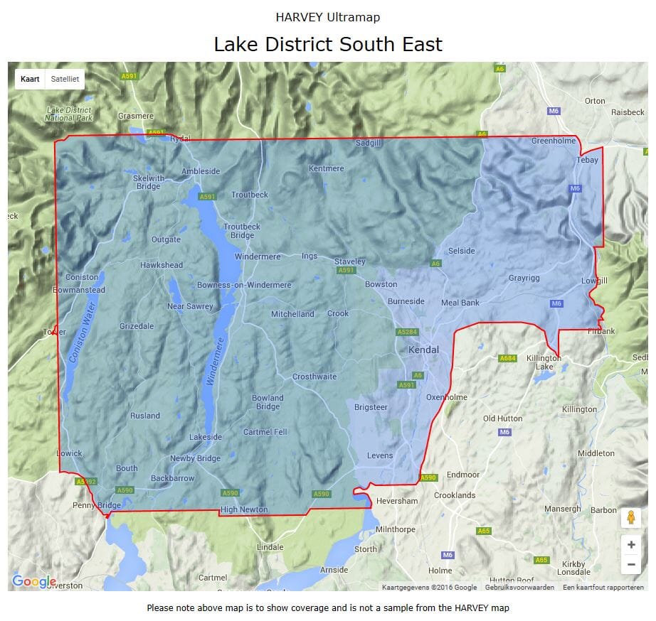 The Map has Lake Windermere in the center. Includes Ambleside, Coniston and Kendal and The Superb Mountain Biking Area of ​​Grizedale Forest.