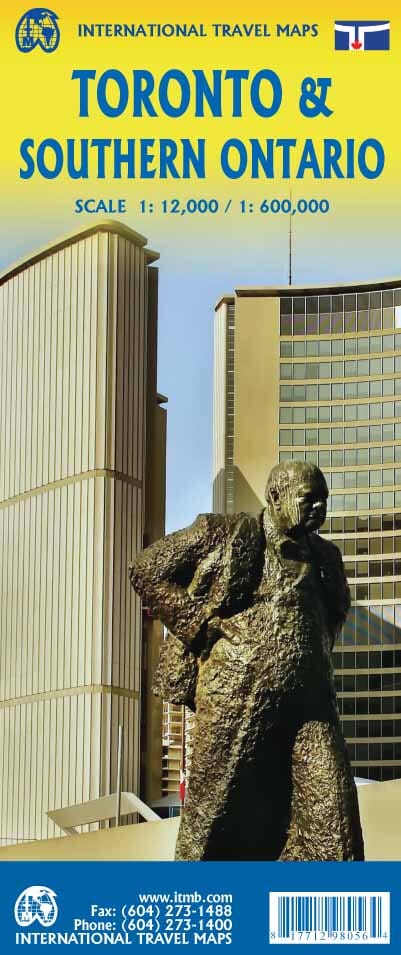 Detailed map of Toronto and map of southern Ontario published by ITM. On the front, the color map of Toronto with a street index, the public transportation map and a zoom on the city center.