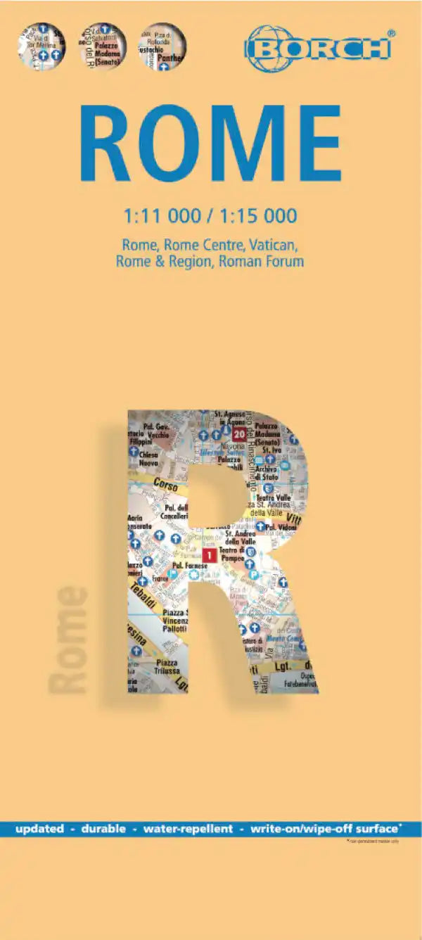 Detailed Plan of Rome published by Borch Map, entirely Laminated so sealed and annotable with an erasable felt. Contains an overall plan of Rome (1/15,000), a city center plan with a street index, the Vatican, the Roman Forum, as well as a plan of the region. Detailed plan of public transport in Rome included.
