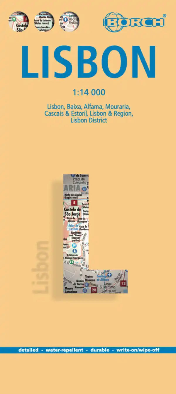 Detailed map of Lisbon published by Borch Map. In addition to the detailed plan of the Lisbon center, there are the plans of the districts of Baixa, Alfama, Mouraria, Cascais and Estoril and a metro plan and a detailed map of the district and the Lisbon region. In fully laminated map, resistant to water and can be annotated with an erasable felt. Scale 1: 14,000 (1 cm = 140 m).