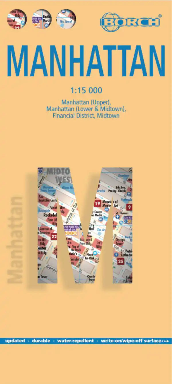 Manhattan plan published by Borch Map. This detailed plan of Manhattan includes on a Lower Manhattan and Midtown and the other Upper Manhattan and the financial district and a metro plan. In fully laminated map, resistant to water and can be annotated with an erasable felt.