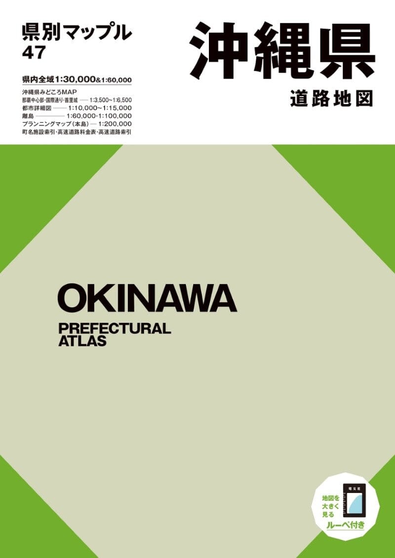 Scale: The atlas offers various scales, including detailed maps of central Naha, Kokusai-dori, and Shuri Castle ranging from 1:3,500 to 1:6,500, detailed maps of the Naha area at 1:10,000, detailed maps of major cities at 1:10,000 to 1:15,000, island-scale road maps of the main island at 1:30,000 and 1:60,000, island maps at 1:60,000 and 1:100,000, and a map of the Naha area at 1:10,000 and 1:15,000.