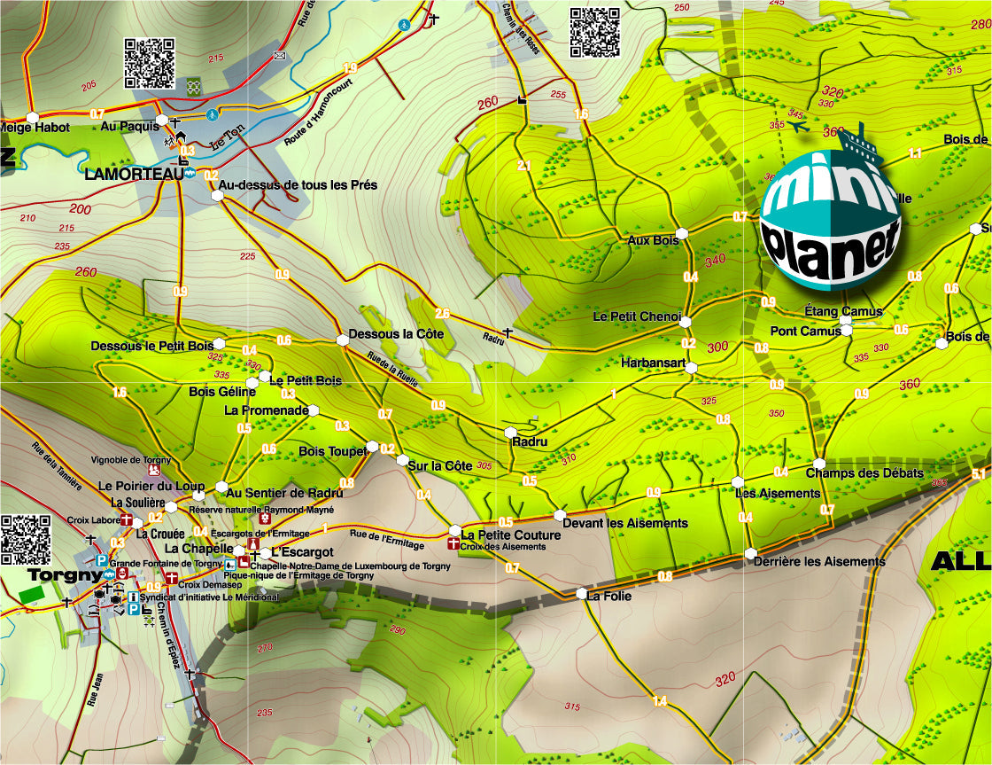 "Gaume Sweet Gaume". In the south of the Ardennes, in Belgium, La Gaume is a region that seduces with its sweetness of life. This mini - planet hiking map brings together 730 kilometers from walks among the Gaulian countryside and forests. Gaume is a territory that essentially brings together the district of Virton. We find on this map the municipalities of Virton (Ethe), Meix - Aux Virton (Vestemahon, Gérouville ...), Rouvroy (Montquintin, Torgin ...) and Saint - Léger as well as the village of Buzenol. Scale 1 / 25,000 (1 cm = 250 m).