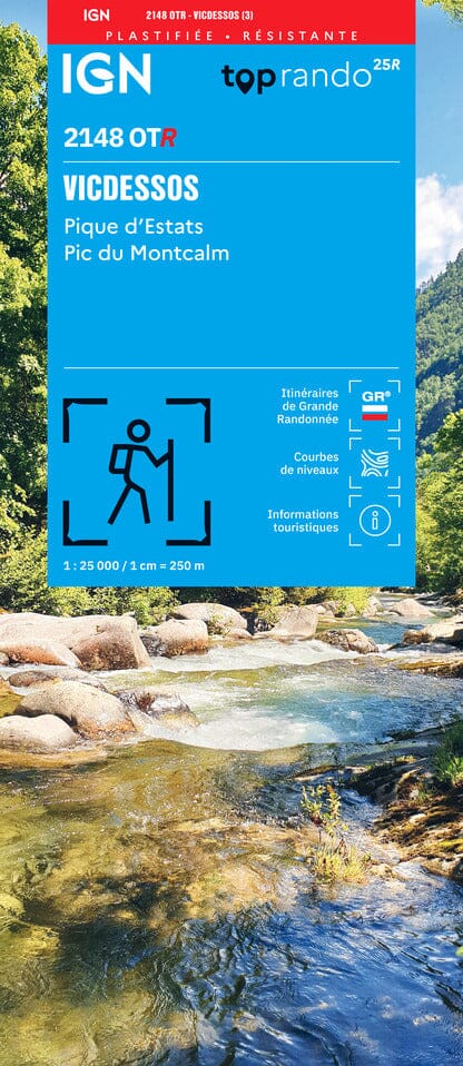 TOP 25 hiking map no. 2148OTR of Vicdessos, Pique d'Estats, and Pic du Montcalm published by IGN. Topographic map with 10-meter contour intervals and a detailed legend (vegetation, rocks, watercourses, etc.). Hiking trails are marked. Scale 1:25,000 (1 cm = 250 m). GPS compatible.
