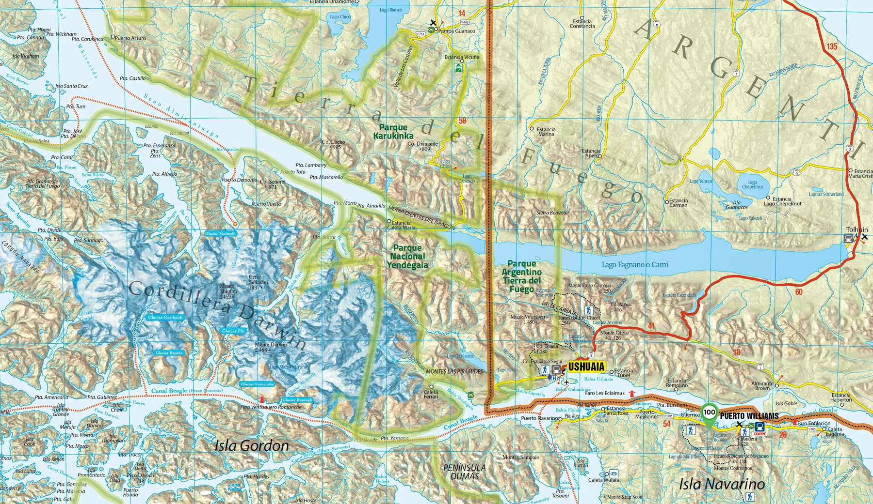 The map highlights the iconic sites of the extreme south of South America: the Beagle Channel , Ushuaia , Puerto Williams , Navarino Island , Alberto de Agostini National Park and the mythical Cape Horn .