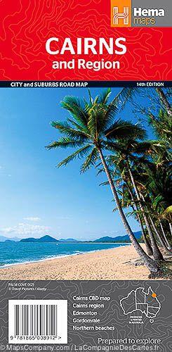 Cairns agglomeration (scale 1/22,500) with a street index published by Hema Maps. On the back, map of the northern beaches, plans of Gordonvale, Edmonton, and the Cairns region.