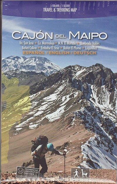 The Cajon del Maipo - Volcán San Jose region of central Chile east of Santiago is featured on a waterproof and tear-resistant map in a series of contoured, GPS-compatible trekking and exploration maps at various scales that make up Trekkingchile. On one side, the main 1:100,000 map covers the region eastward along the Maipo River from Las Vertientes, near its confluence with the Rio Colorado, to Volcán San Jose on the Argentine border. The map shows the region's network of local roads and tracks, indicating both unmarked and marked hiking trails. A wide range of icons indicates various tourist facilities and places of interest, including several types of accommodation, restaurants and cafes, banks, fuel reserves, recreational areas for climbing, canyoning, rafting, and more.