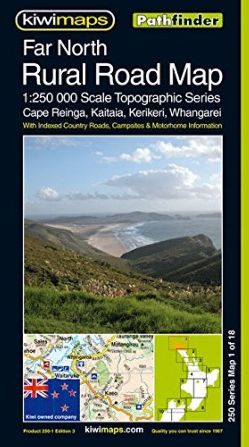Far North region of New Zealand's North Island, including Cape Reinga, Kaitaia, Kerikeri and Whangarei, on a detailed and indexed 1:250,000 road map from Kiwimaps, with extensive tourist information including a table of local campsite facilities, a comprehensive index etc.