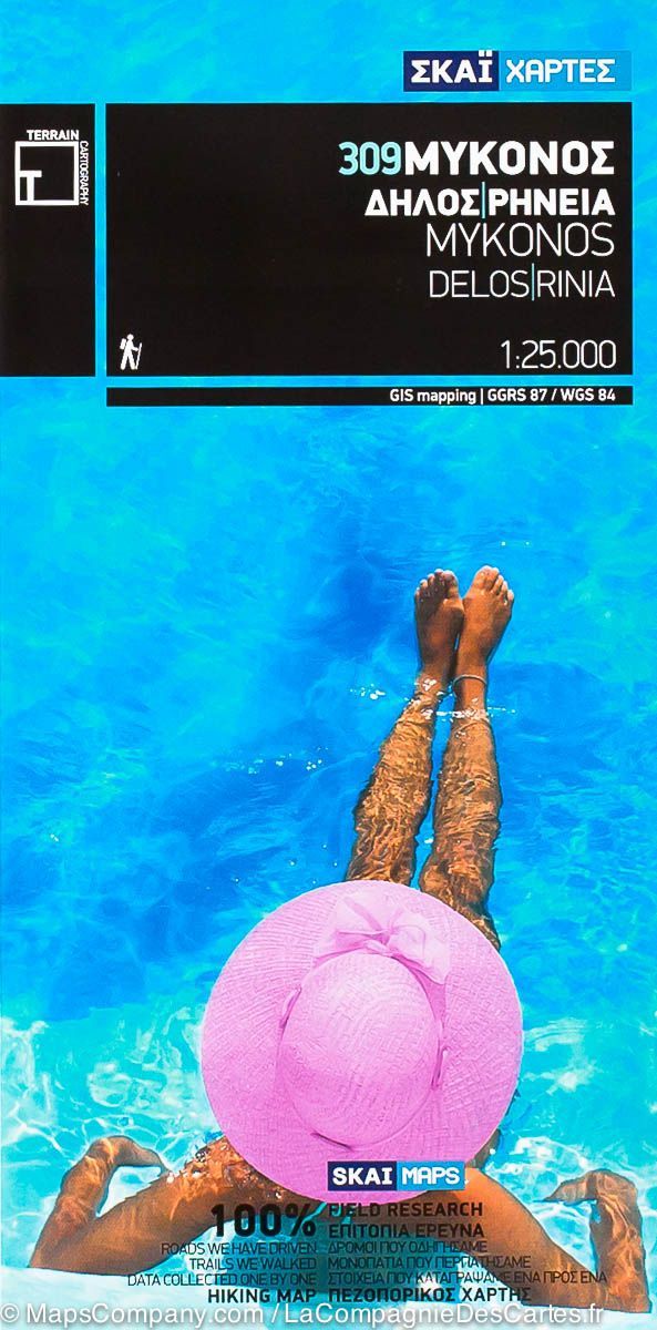Waterproof topographic map of Mykonos Islands, Delos and Rinia (Greece) published by Cartography. 20 m space curves, indication of hiking trails. Tourist information (beaches, points of interest, maritime links ...) and selection of hikes with duration and distance. Bilingual English and Greek. Detailed map protected by a laminated case. Scale 1: 25,000 (1 cm = 250 m).