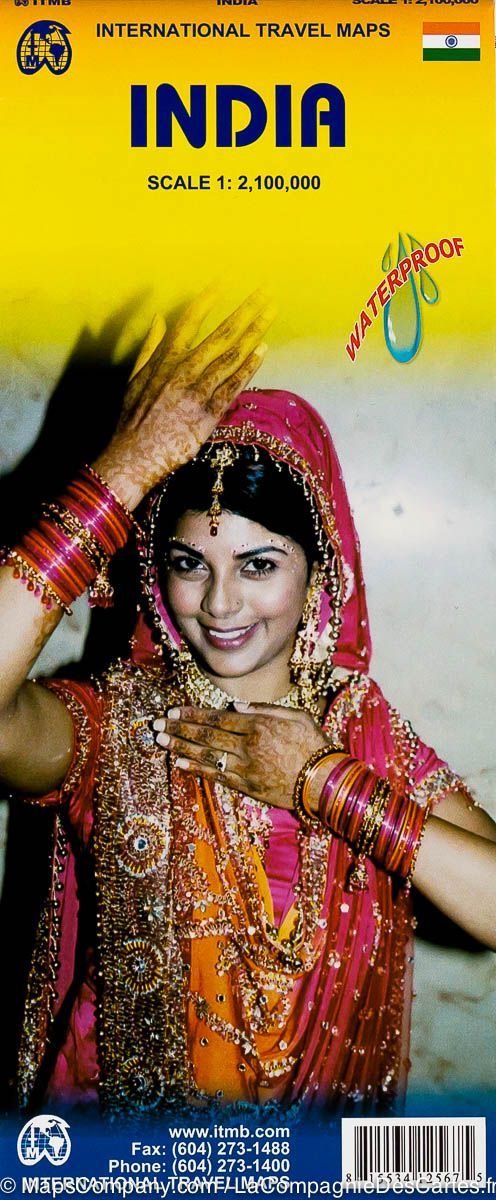 Waterproof road map of the entire India published by ITM. Detailed map including a plan of Delhi in an inset. Mapping the relief and index of cities included. Scale 1 / 2,400,000 (1 cm = 24 km).