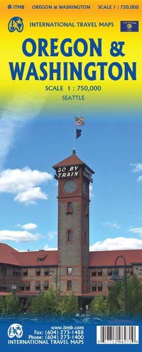 Road map of the state of Oregon and the state of Washington published by ITM. On the front, the map covers the state of Washington with insert, a plan of the city center of Seattle. It also covers part of the Oregon and British Columbia (Canada). The back covers the state of Oregon and part of northern California. Indication of points of interest, campgrounds etc. Scale 1: 750 000 (1 cm = 7.5 km).