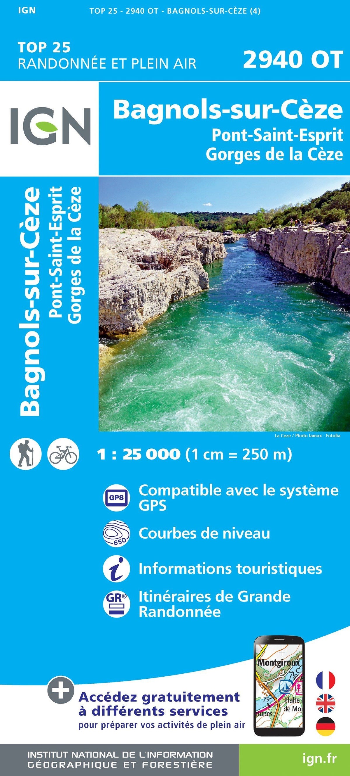 TOP 25 Map No. 2940 OT - Bagnols-sur-Cèze, Pont-St-Esprit, Cèze Gorges | IGN
