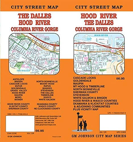 Urban map of The Dalles and Hood River with legend. Insets of Mount Hood/Parkdale, North Bonneville, Dufur, Shaniko, Maupin, Antelope, Goldendale, Wasco, Grass Valley, Moro, and Rufus. On the reverse side, map of the Columbia River Gorge with index of cities, communities, streets, and places of interest. Inset of the Columbia River National Scenic Area.