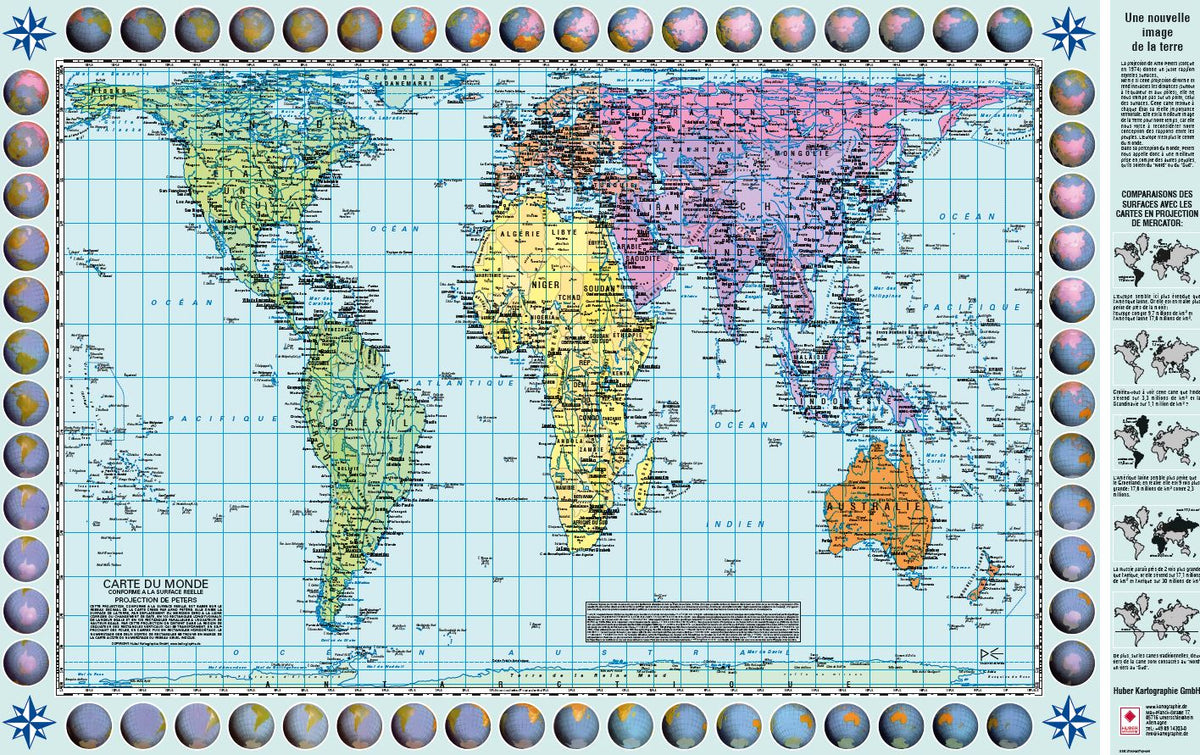 Political world wall map (in French) with a Gall-Peters projection (not Mercator). Sold rolled in a tube.