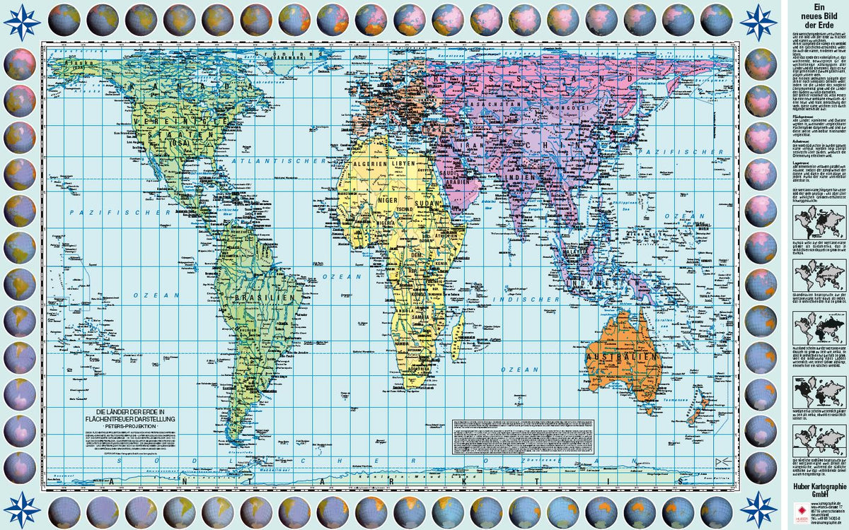Political world wall map ( in German ) with a Gall-Peters projection (not Mercator). Sold rolled in a tube.