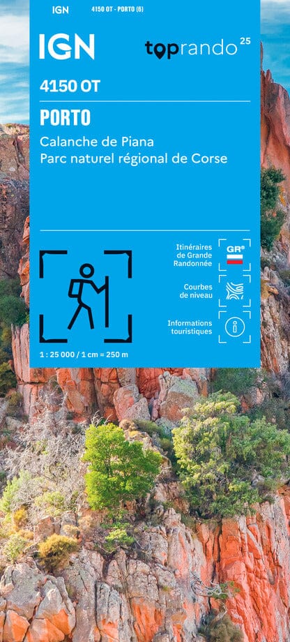 IGN TOP 25 topographic map no. 4150OT of the Porto region (Corsica), in the west of the island, covering part of the Corsica Regional Natural Park. Hiking map with contour lines spaced 10 meters apart and a detailed legend (vegetation, rocks, rivers, etc.). Hiking trails indicated.