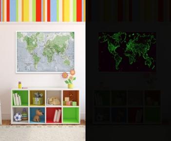 Quand la nuit tombe, cette carte du monde se présente comme un monde éclairé. Cette carte du monde "Glow in the Dark" est parfaite pour une chambre d’enfants. C’est un outil éducatif et instructif qui peut, entre autre, aider les enfants qui ont peur de l'obscurité. C’est aussi un gadget amusant à afficher partout dans la maison.