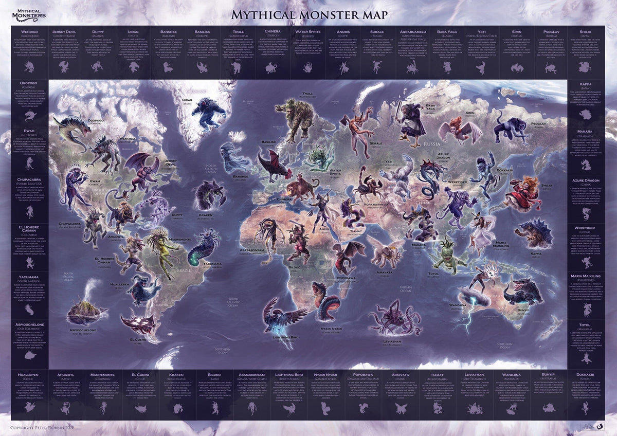 Ce poster du monde présente quarante-cinq monstres incroyables de partout dans le monde. La carte présente une description du pays d'origine des Monstres et de leurs caractéristiques.