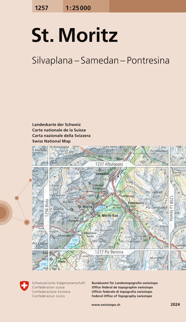Carte topographique de la région de St-Moritz destinée aux randonneurs, alpinistes, urbanistes, individualistes et amateurs de découvertes.